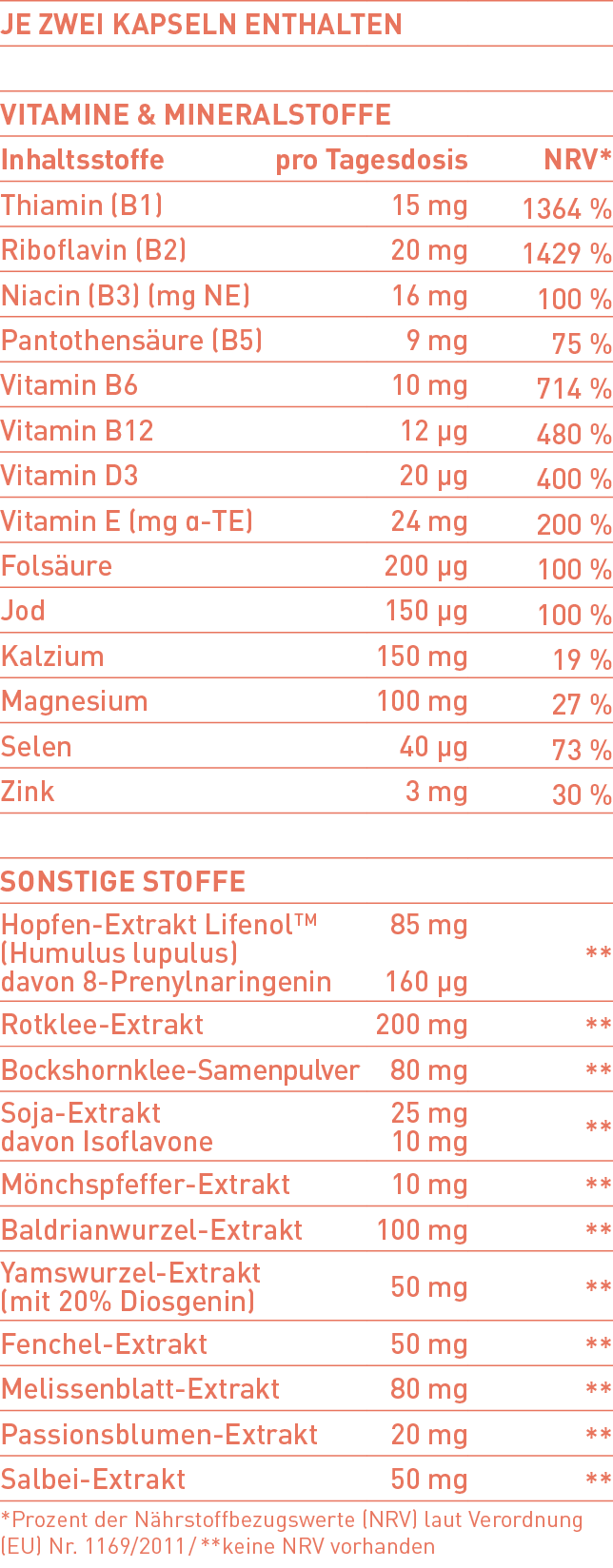 Mit seinen spezielle pflanzlichen Inhaltstoffen und Mikronährstoffen können Hitzewallungen verringert werden (1,2), trägt es zu normaler Hormonbildung (3) und dem Erhalt gesunder Knochen (4) bei.